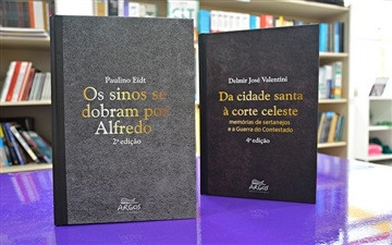 Conhecer a história do local onde se está inserido nos possibilita resgatar e preservar a tradição de quem viveu antes de nós. É uma oportunidade de compreender alguns motivos da nossa era. Contribuindo para esse processo, a Argos Editora da Unochapecó lançou em 2017 duas obras que relatam fatos históricos, conflitos sociais e abordagens políticas que fizeram parte da realidade da população do Oeste Catarinense. Intitulados “Os sinos se dobram por Alfredo", escrito por Paulino Eidt, e “Da cidade Santa à corte celeste: memórias de sertanejos e a Guerra do Contestado”, com autoria de Delmir José Valentini, os livros fazem parte da coleção Regionais. Abordando recortes da história da região, os exemplares destinam-se a um público variado, incluindo os próprios pesquisadores, as pessoas que fazem parte dessas histórias e aqueles que têm interesse em conhecer a região. Em 25 anos de existência, a Argos possui mais de 280 obras publicadas. Segundo a coordenadora, professora Rosane Silveira, a Argos se destaca nesse meio por ser uma das editoras universitárias que mais publica sobre a sua região. Os dois recentes livros integram uma comemoração programada para marcar os 25 anos da editora. As obras O livro “Os sinos se dobram por Alfredo” apresenta a teia de relações culturais, econômicas e sociais que teceram a vida dos alemães do projeto Porto Novo (atualmente, os municípios de Itapiranga, São João do Oeste e Tunápolis), fundado pela Companhia de Jesus em 1926, no extremo-oeste de Santa Catarina. Essa história foi reconstruída com a criação de um personagem fictício chamado Alfredo. A narrativa mescla ficção e realidade, na tentativa de tornar mais vivas os relatos e fatos históricos da época. Já a obra “Da cidade Santa à corte celeste: memórias de sertanejos e a Guerra do Contestado” aborda antigos moradores dos redutos que relataram as experiências pelas quais passaram. Esteve impressa nos sertanejos, a partir dos seus depoimentos, a culpa pelo derramamento de sangue que envolveu a população da região do Contestado no início do século XX. Decorridos quase vinte anos da primeira edição deste livro, a pesquisa histórica avançou e uma quarta edição desta obra reveste-se de significado singular, exatamente no ano em que a Guerra do Contestado fecha o ciclo do seu centenário (1912-1916 / 2012-2016). Ambas os livros estiveram em processo de editoração durante o ano de 2016.